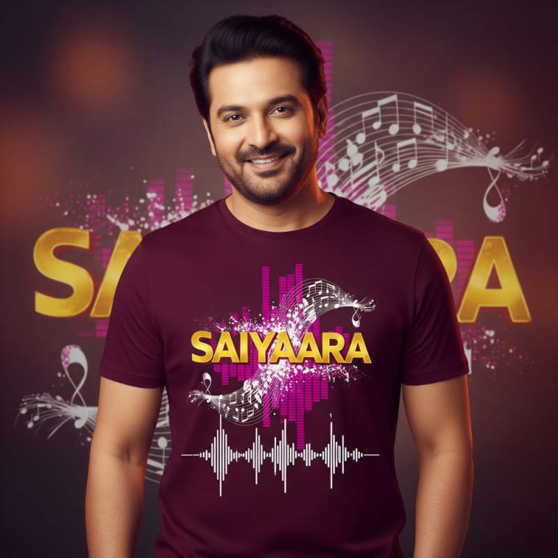 Celebrate your love for Bollywood with this wine color men’s T-shirt inspired by the soulful movie Saiyaara. The design features the movie name paired with a musical print, capturing the essence of romance and melody.