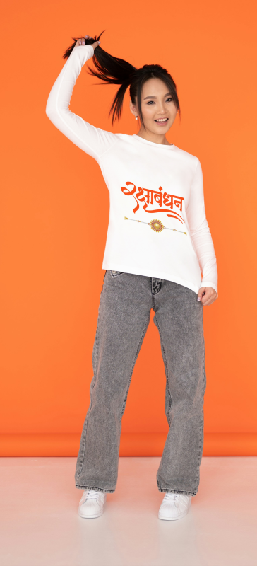 Product Details: Material: 100% Cotton, 250 GSM Sleeves: Full sleeves Color: White Fit: Regular fit Design: Raksha Bandhan and Rakhi-themed print Neckline: Round neck Care: Machine wash cold, tumble dry low, avoid bleach Description: Celebrate the bond of love and protection with this White Cotton Full-Sleeve T-Shirt for women, featuring a combined Raksha Bandhan and Rakhi print. This t-shirt is crafted from high-quality 100% cotton with a 250 GSM thickness, offering a soft and durable feel that's perfect for the festive season. Design & Style: The t-shirt showcases a unique and elegant design that includes both Raksha Bandhan and Rakhi motifs. The print is thoughtfully placed to add a festive flair, making it ideal for Rakhi celebrations. Fit & Comfort: Designed for a regular fit, this t-shirt provides a comfortable wear experience while flattering your silhouette. The full sleeves add an extra layer of warmth and style, suitable for various occasions. Color & Care: The white fabric acts as a perfect canvas for the Raksha Bandhan and Rakhi print, making it stand out. For long-lasting wear, machine wash in cold water and tumble dry on low. Avoid using bleach to maintain the vibrancy of the print. Why This T-Shirt: This t-shirt is perfect for those who want to celebrate Raksha Bandhan in style or gift something special to their sister. Its thoughtful design and comfortable fit make it a must-have for the festive season. |