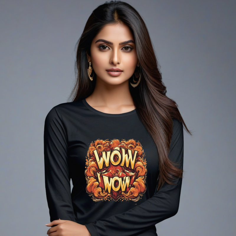 Make a bold statement with the Black Full Sleeve Cotton T-Shirt for Women – WOW Print. Crafted from 250 GSM premium cotton, this tee offers a perfect blend of comfort, durability, and style. The trendy WOW graphic print on a classic black base makes it a must-have for fashion-forward women. Key Features: Perfect for casual outings, college, travel, or lounging, this WOW print black tee adds a touch of style and attitude to your everyday look. |