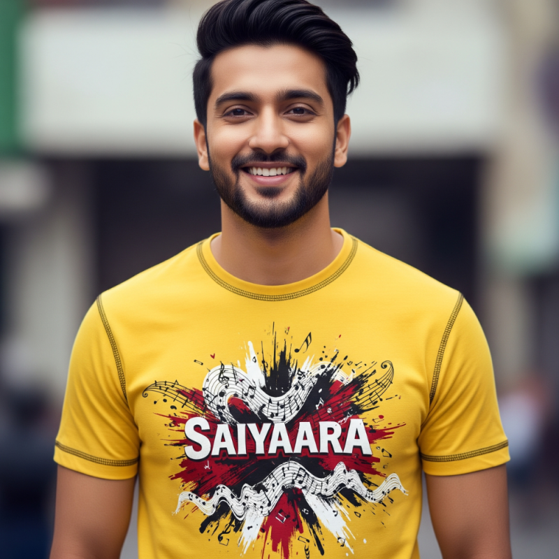 Brighten up your style with this Yellow Saiyaara Movie Themed T-Shirt. Designed for comfort and trend, it brings together the vibrancy of yellow with the charm of Bollywood.