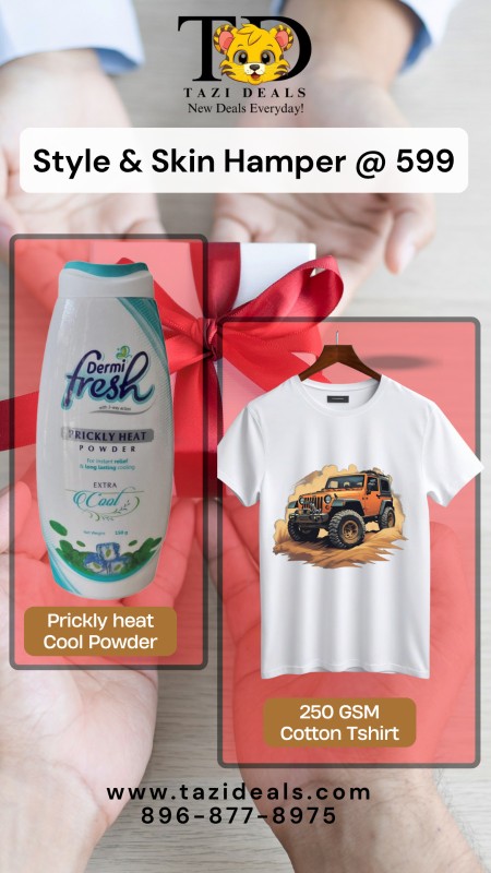 Style & Skin Hamper for Brothers - Cool Looks. Cooler Comfort. Give your brother a gift that keeps him stylish and feeling fresh all day long. The Style & Skin Hamper for Brothers combines fashion-forward design with skin-soothing essentials—perfect for the modern man who likes to look good and feel even better. This curated duo features a bold Jeep-patterned white cotton T-shirt made from premium 250 GSM fabric, designed for comfort and statement style. It’s paired with the Dermi Fresh Prickly Heat Powder – Extra Cool, offering instant relief from heat, sweat, and irritation—ideal for the summer season. What’s Inside: Stylish and breathable for all-day wear Durable, high-quality cotton for a confident fit Perfect for casual outings, drives, or weekend lounging Provides instant cooling and soothes skin irritation Helps prevent prickly heat, rashes, and sweat discomfort Keeps skin feeling fresh and dry throughout the day Perfect for: Rakhi, or a surprise to show your brother you care—in style and comfort. |