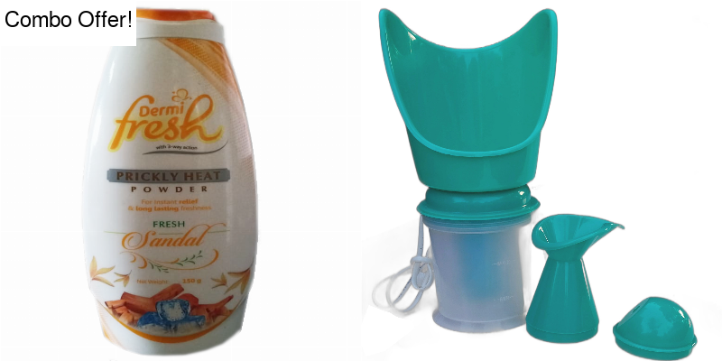 3 in 1 Steamer for Facial Sauna, Cough and Cold with Dermi Fresh Prickly Heat Powder - Sandal Fragrance - 150G - Combo Offer
