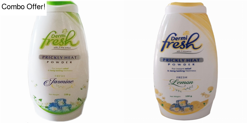 Stay refreshed and protected with Dermi Fresh Prickly Heat Powder – Jasmine + Lemon Fragrance – 150g (Combo Offer). This dual fragrance pack combines the soothing floral aroma of jasmine with the zesty freshness of lemon, giving your skin all-day comfort and fragrance. Specially designed to relieve prickly heat, rashes, and sweat irritation, its sweat-absorbing formula keeps your skin cool, dry, and irritation-free, even in hot and humid conditions. Perfect for both men and women, this combo is an ideal summer essential. Key Features: Enjoy lasting freshness and cooling comfort with Dermi Fresh Prickly Heat Powder – Jasmine + Lemon Fragrance – 150g (Combo Offer), your go-to skincare solution for summer. |