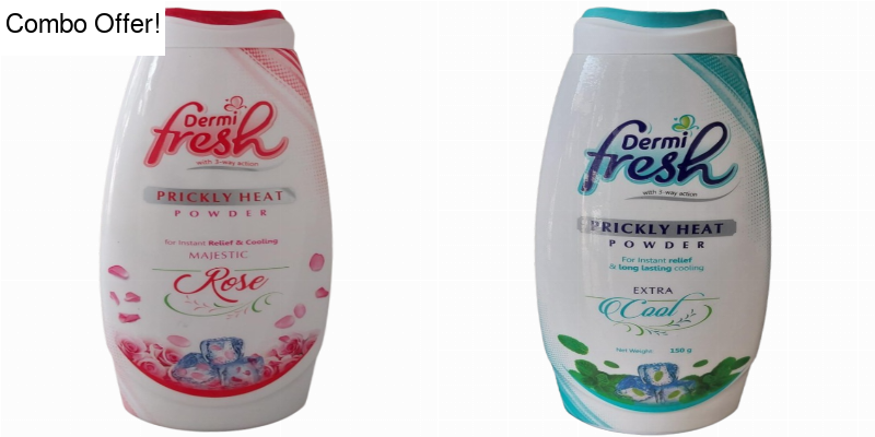 Stay refreshed, cool, and irritation-free with Dermi Fresh Prickly Heat Powder – Rose + Extra Cool Fragrance – 150g (Combo Offer). This dual fragrance powder blends the soothing aroma of rose with an extra cooling formula to provide instant relief from prickly heat, rashes, and itching. Its sweat-absorbing properties keep your skin dry, soft, and comfortable throughout the day, making it ideal for hot and humid weather. Suitable for both men and women, this combo is perfect for daily summer use. Key Features: Enjoy all-day freshness and cooling comfort with Dermi Fresh Prickly Heat Powder – Rose + Extra Cool Fragrance – 150g (Combo Offer), your essential summer skincare solution. |